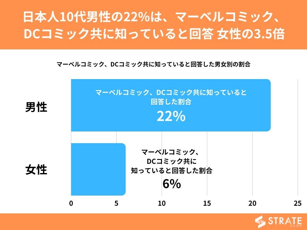 日本人10代男性の2割の方がマーベルコミック、DCコミックどちらも知っていて、女性の3.5倍多いことが分かりました。