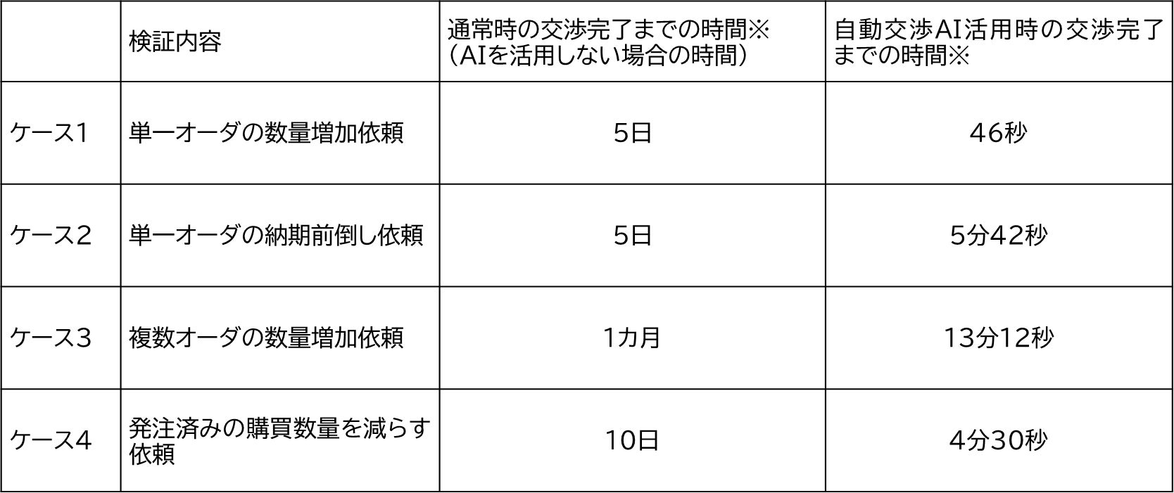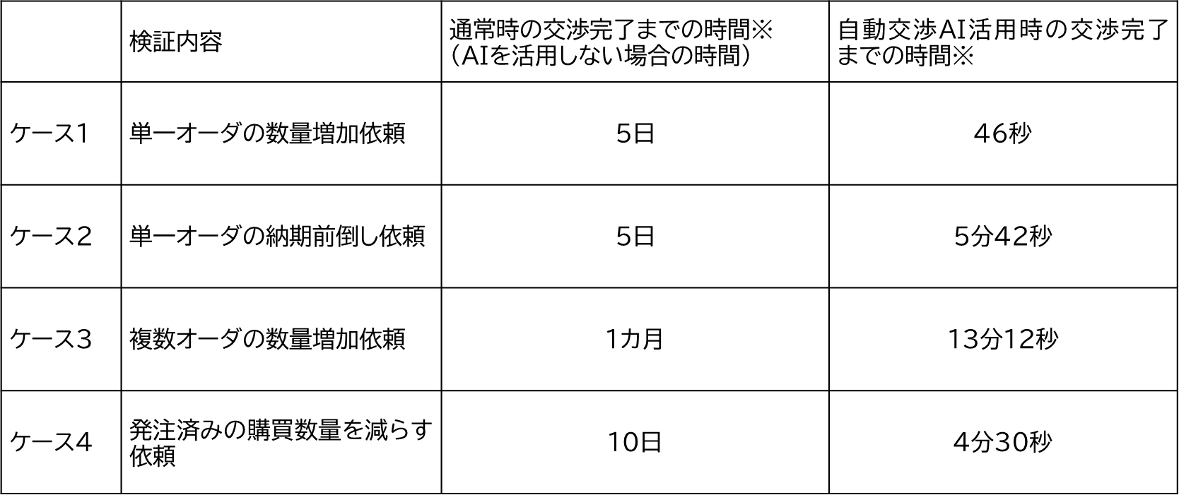 今回の実証実験では、販売側の在庫で購買側と調整可能な解が存在する場合には、自動交渉AIと販売側担当者の間で合意することができ、従来、販売側との調整・交渉にかかっていた時間を以下のように短縮することができました。