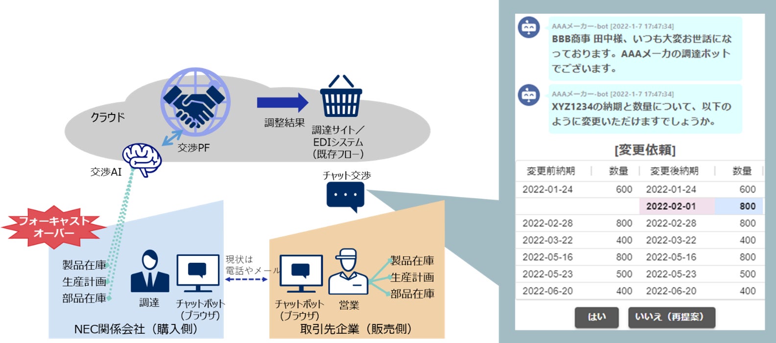NEC関係会社が実際に取引先企業から購入している部品に関して、購買側(NEC関係会社側)が生産計画の変更を受けて発注数量や納期の変更が必要になったシーンを想定し、部品の在庫状況と手配状況の実データを用いて、購買側に導入された自動交渉AIが、チャットボットを介して販売側(取引先企業)の担当者(人)と納入条件の変更調整を行えるかを検証しました。