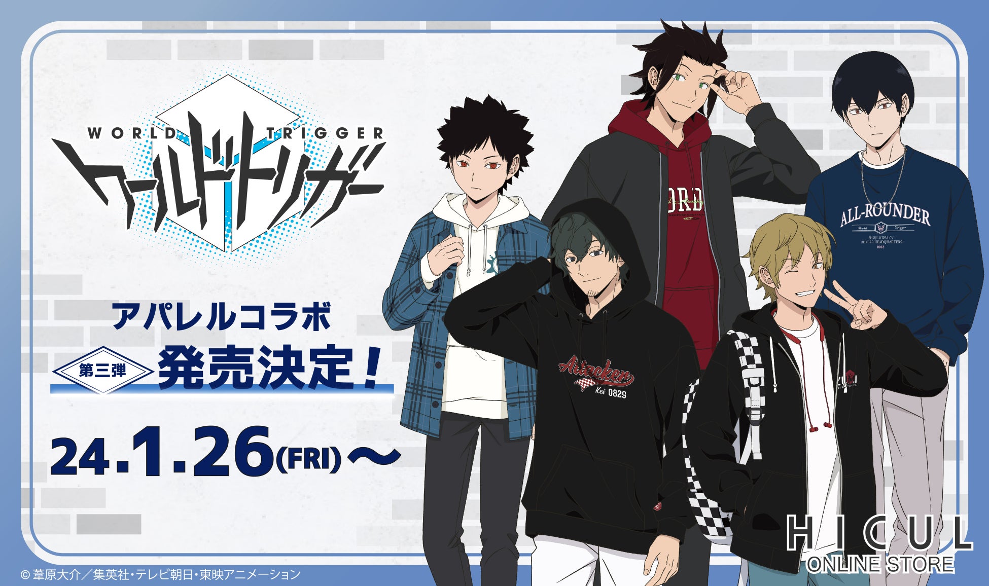 アパレルメーカーである株式会社ブランチ・アウト(以下、ブランチ・アウト、本社:東京都渋谷区、代表取締役社長:大谷 真一)は、アニメ・漫画版権に特化したアイテムを取り扱うECサイト『HICUL(ハイカル)』よりTVアニメ「ワールドトリガー」描きおろしイラスト使用のアイテムを販売中!