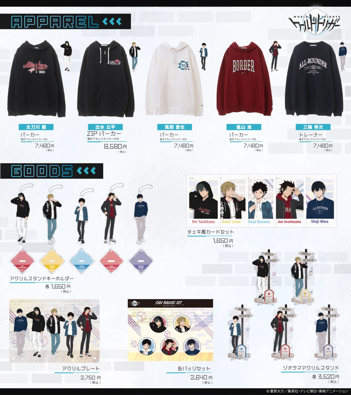 好評を博した第一、二弾に続く第三弾のラインナップは、太刀川慶、出水公平、風間蒼也、嵐山准、三輪秀次の全5名。普段使いしやすい、「ワールドトリガー」らしさとファッション性を兼ねそろえたアパレルアイテムと雑貨アイテムを販売しております。