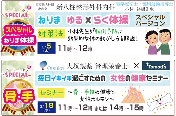 【健康イベント】薬局トモズ練馬高野台店(ねりたかルーム) 3月5日「ねりま ゆるらく体操」、3月18日「骨・手指の健康チェック 女性の健康セミナー」【参加無料】
