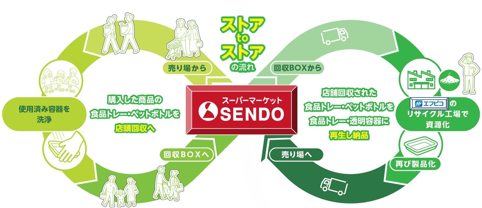 株式会社エフピコ(本社:東京都新宿区、代表取締役会長:佐藤 守正、以下「エフピコ」)は株式会社せんどう(本社:千葉県市原市、代表取締役社長:小澤 三夫、以下「せんどう」)と協働し、現在店舗で取り組んでいる「トレーtoトレー」、及び使用済みペットボトルを回収し新たな透明容器に生まれ変わらせる「ボトルto透明容器」を行い、再び店頭で「エコトレー」「エコAPET」を使用する「ストアtoストア」、「水平リサイクル」を更に拡大いたします。
