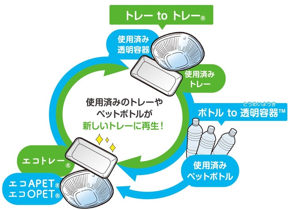 「トレーtoトレー」、及び使用済みペットボトルを新たな食品容器に生まれ変わらせる「ボトルto透明容器」において製造されたエコ製品「エコトレー」「エコAPET」を売場で積極的に使用し、地球資源の循環及びCO2排出量削減を積極的に行い「持続可能な社会の実現」「地域のエコリーダー」を目指してまいります。