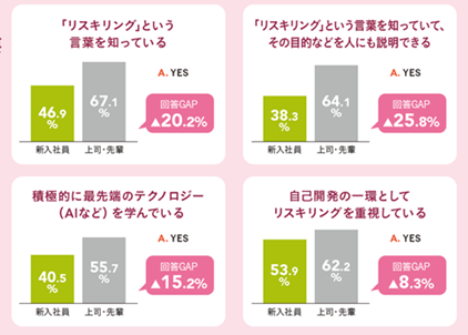 「『リスキリング』という言葉を知っている」「その目的などを人にも説明できる」と答えた新入社員は半数以下となりました。先輩・上司とのギャップは20%以上となり、社会人経験をこれから積み上げていく新入社員は「リスキリング」の目的や意味合いは理解できていない状況だと考えられます。むしろ、最新の技術動向やスキルはある程度保有している可能性があるため、アウトプットしていくための応用力を身に着けることが重要といえるでしょう。