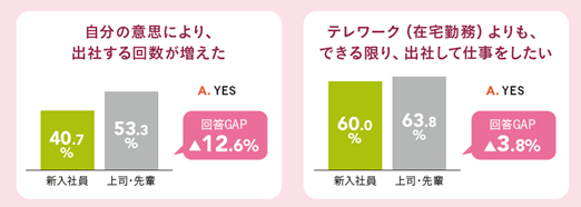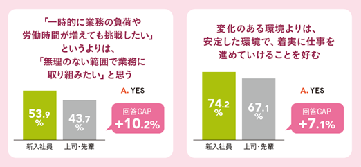 ― 70%以上が「安定した環境で、着実に仕事を進める」ことを志向し(対上司・先輩比:+7.1%)、出社も意欲的