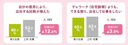 また、実際の働く環境については、自分の意思で出社する割合は4割に留まりますが、「テレワーク(在宅勤務)よりも、できる限り、出社して仕事をしたい」と考えている新入社員は6割を超える結果となりました。