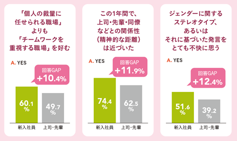 「個人の裁量に任せられる職場」よりも「チームワークを重視する職場」を好む割合が約60%、先輩・上司の回答割合より約10%多い結果となりました。また、周囲との精神的な距離は近づいていると感じている新入社員も多く、人と人との調和を大切にする様子が伺えます。さらに、ジェンダーに関するステレオタイプやそれに基づく発言を不快に感じる傾向が強く(51.6% 対上司・先輩比:+12.4%)、多様性やインクルージョンに対する意識が高いといえます。