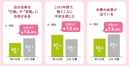 「自分自身の『行動』や『言動』に自信がある」と回答した新入社員は約40%と、上司・先輩の回答率より約14%低く、半数以上が自信を持てていません。「この1年間で、働くことに不安を感じた」新入社員は7割近くにのぼり(対上司・先輩比:+13.5%)、入社間もないこともあり、働くことに対して不安を感じる傾向が強いことがわかります。また、仕事の成果も実感できる部分が少なく、自らの「行動」や「言動」に対しても自信を持てていない状況です。メンタリングやキャリア開発などの伴走支援を通じて、自らの「行動」や「言動」に自信を持ってもらうことが重要といえるでしょう。