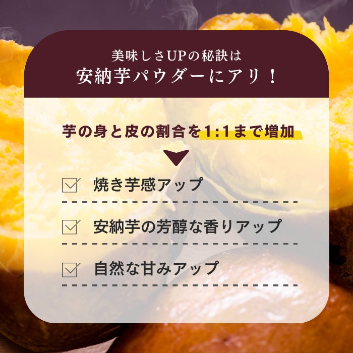 ワンランク上の美味しさを求め、安納芋の身と皮の割合を調整したことで、皮部分の「焼き芋感」が一層強調され、焼きたての安納芋の芳醇な香りとうまみを楽しめる贅沢な仕上がりに。