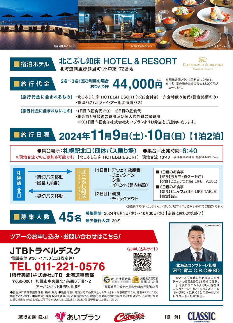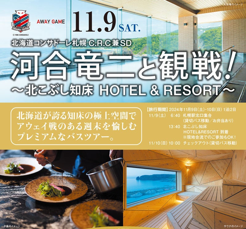 株式会社あいプラン(北海道札幌市)が北海道コンサドーレ札幌と企画するプレミアムなバスツアー。北こぶし知床HOTEL&RESORTへの宿泊と、河合竜二C.R.Cと一緒にアウェイ戦を応援する特別なプログラムです。