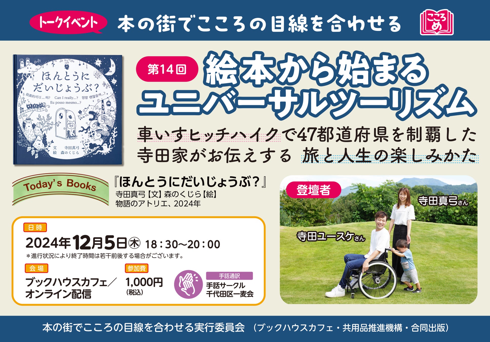 12月5日(木)トークイベント開催 本の街で心の目線を合わせる 第14回「絵本から始まるユニバーサルツーリズム~車いすヒッチハイクで47都道府県を制覇した寺田家がお伝えする 旅と人生の楽しみかた~」を開催いたします。