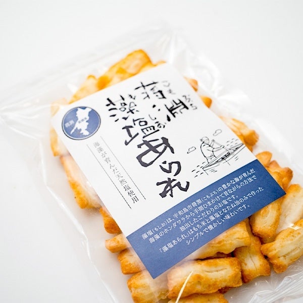 愛媛県宇和島市の蒋渕(こもぶち)の豊かな海がもたらす藻塩を使用。天然の海藻から丁寧に抽出した塩ともち米、なたね油だけで作られたシンプルで懐かしい味わいが楽しめます。藻塩の深みある旨味が広がり、噛むほどに素材の美味しさが感じられます。