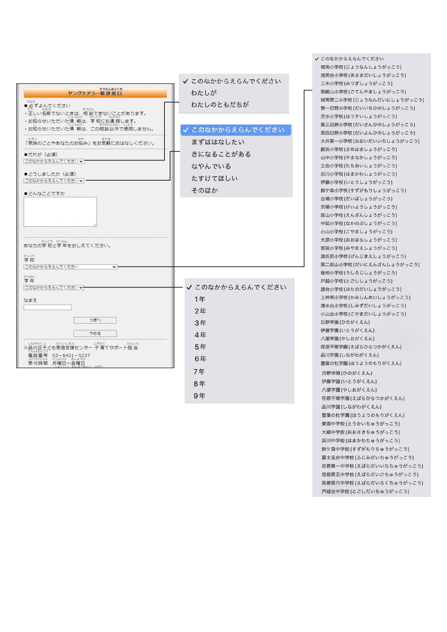 令和5年7月から、無料通話アプリLINEを活用した「品川区ヤングケアラーサポートLINE」を開設し、当事者からの相談を受け付けていますが、LINEを利用できない児童・生徒は、Web上でのツールを利用できない状況にあったため、今回新たに、区から全児童・生徒に貸与しているタブレット端末上に、相談の入り口となるツールを導入しました。