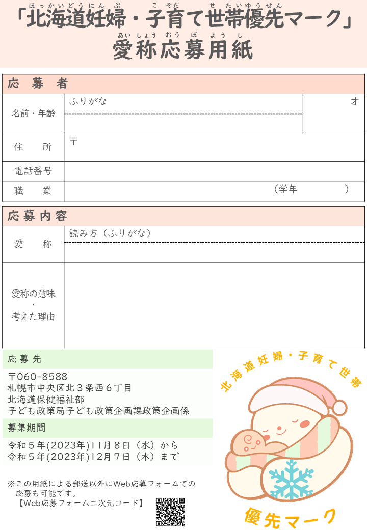 ・募集方法の詳細については、「『北海道妊婦・子育て世帯優先マーク』愛称募集要項」を参照してください。