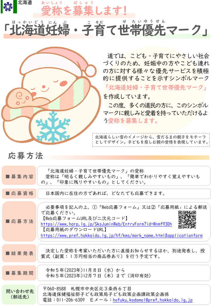 北海道では、こども・子育てにやさしい社会づくりのため、妊娠中の方やこども連れの方に対する様々な優先サービスを積極的に提供することを示す「北海道妊婦・子育て世帯優先マーク」を作成しており、この度、多くの道民の方に親しみと愛着を持っていただけるよう愛称を募集します。