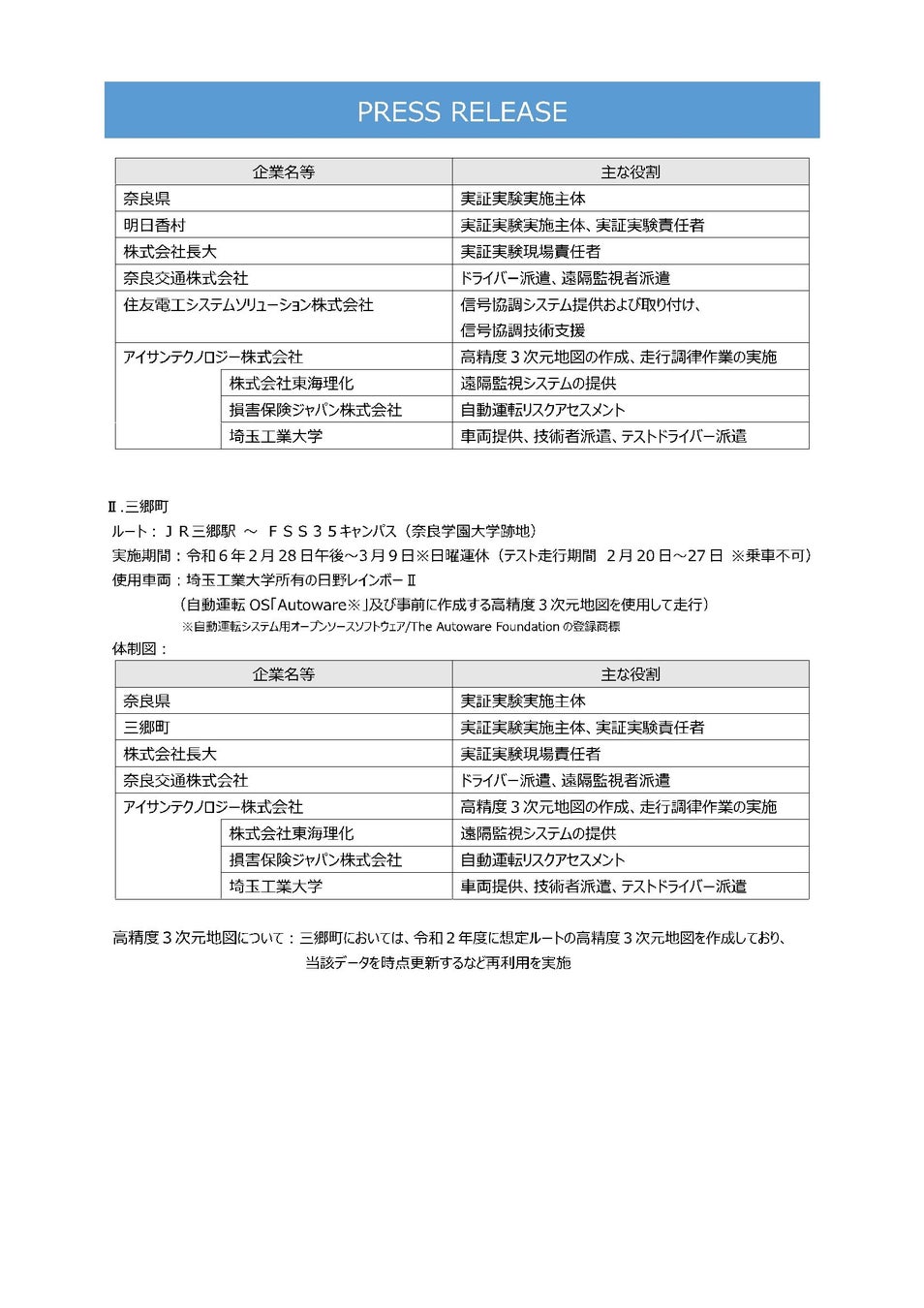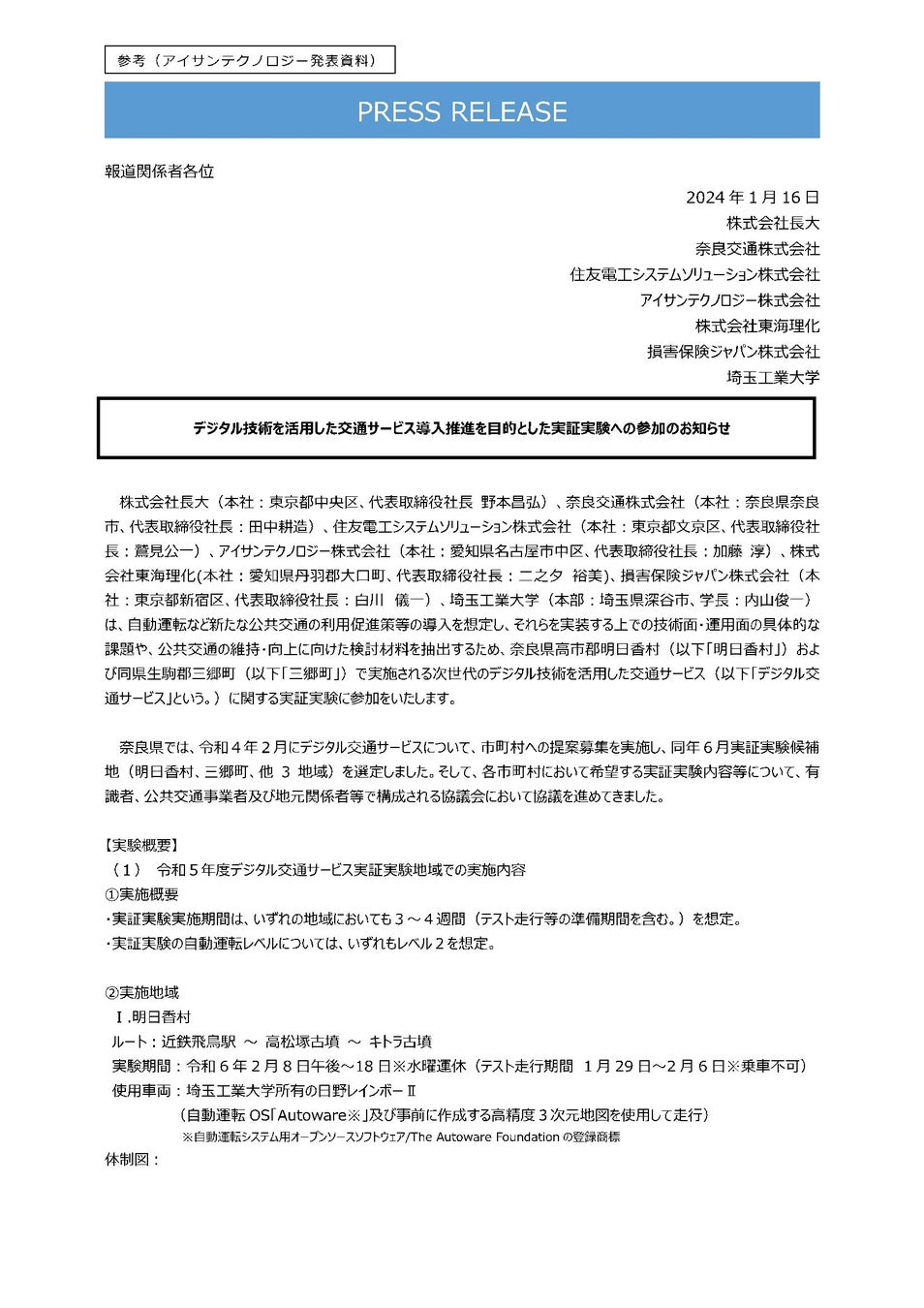 株式会社東海理化 (本社:愛知県丹羽郡大口町 代表取締役社長:二之夕 裕美)は、奈良県が地域特性を踏まえたデジタル技術を活用した交通サービスの導入を目的とし、同県高市郡明日香村および同県生駒郡三郷町で実施する自動運転バスの実証実験(※)に参画します。