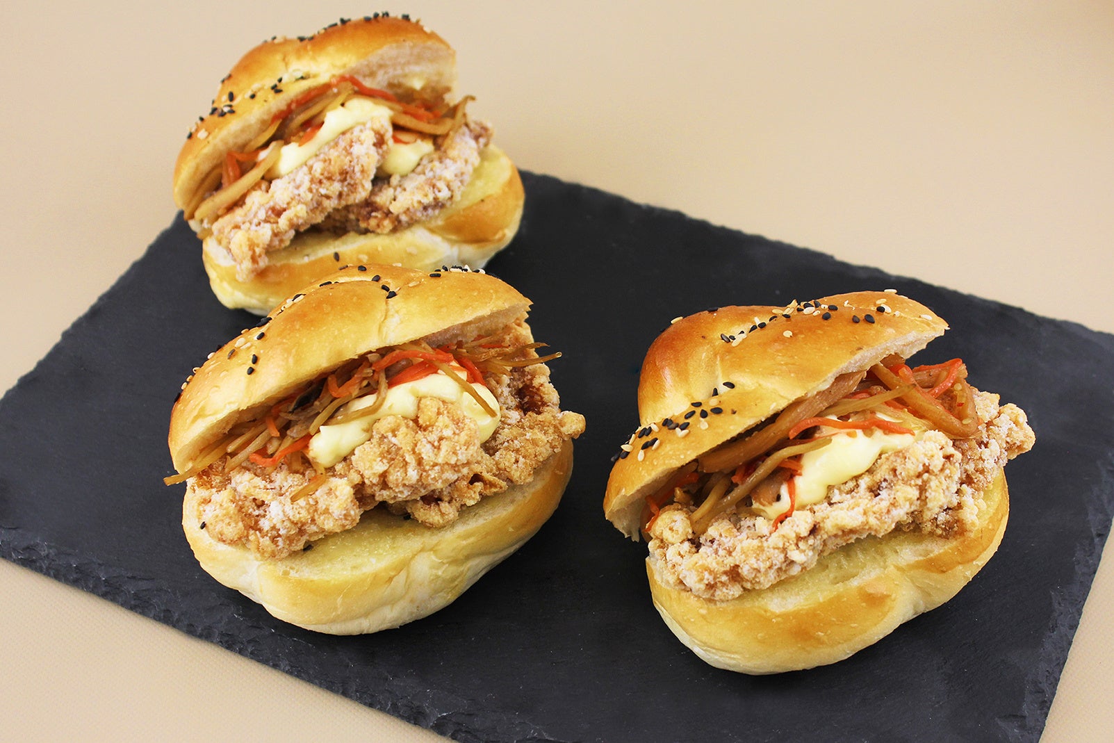 竜田揚げとシャキシャキとしたきんぴらごぼうをサンドしました。シャキッと歯ごたえの残るきんぴらごぼうと、パンからはみ出る竜田揚げはボリューム満点。ガッツリ食べたい時におすすめのおかずパンです。