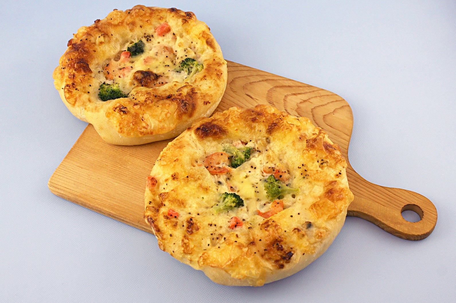 国内産もち小麦と、デュラム小麦を使用したサワー種を配合したもっちり噛み応えのあるピザ生地にクラムチャウダーソースを塗り、エビとブロッコリーをトッピングし焼き上げました。(国内産もち小麦は小麦粉のうち20%を使用)食べ応えのある具だくさんな生地とクリーミーな味わいに、体も心も満足する一品です。