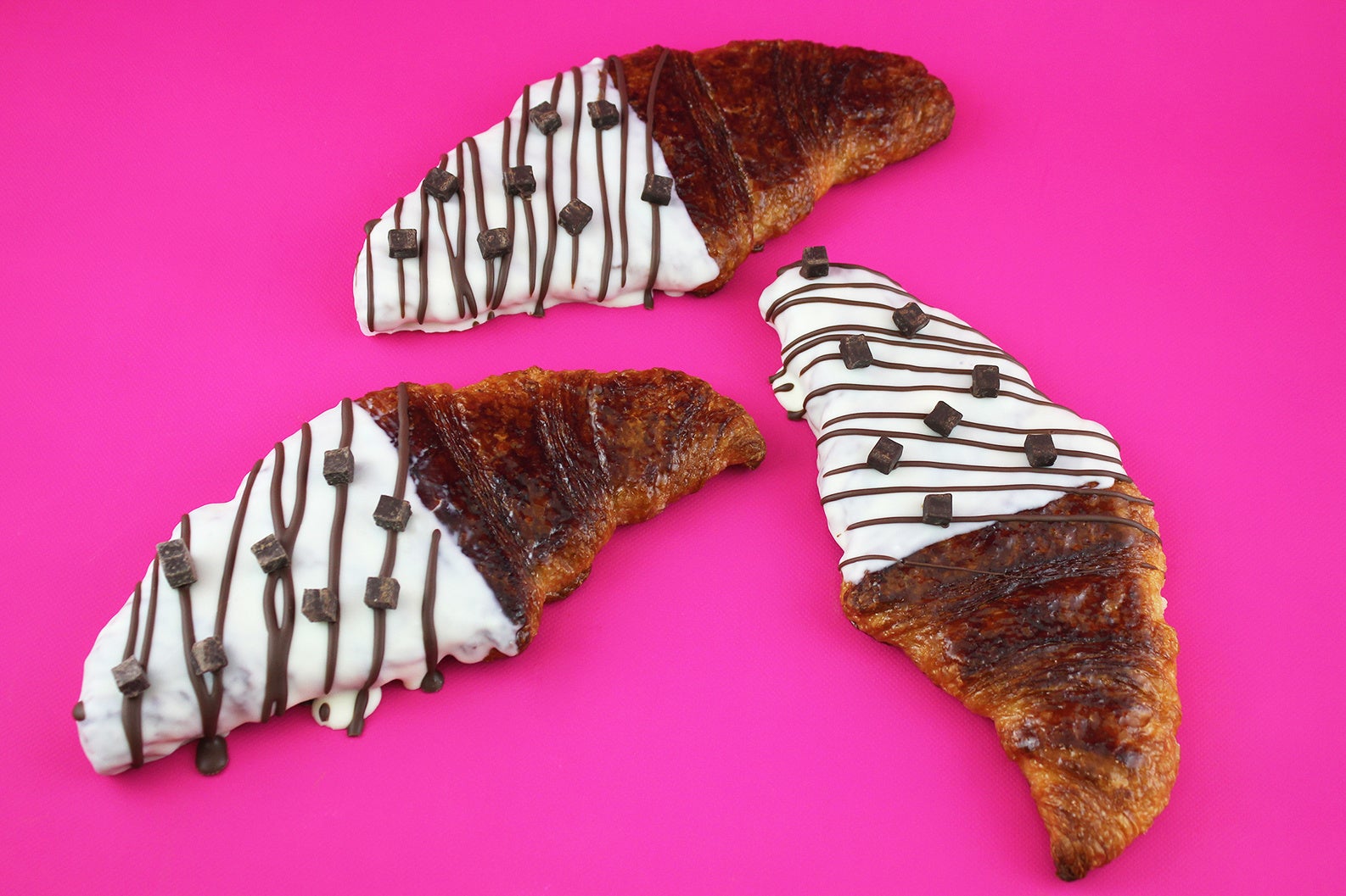 グラニュー糖をかけ、プレスして焼き上げたザクザク、カリカリのクロワッサンにホワイトチョコをトッピングしました。デコレーションされた見た目が可愛らしく、パイのようなザクっとした食感が楽しい新感覚のスイーツパンです。