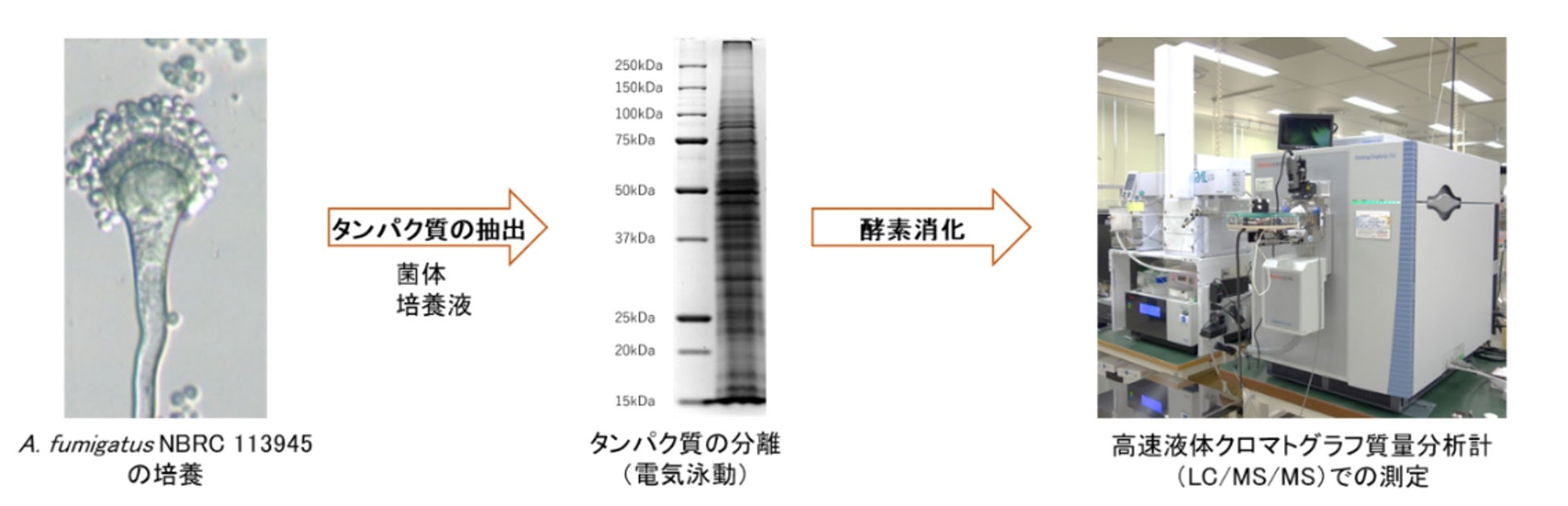 人に対して病原性を持つAspergillus属を含む複数のカビがエアコンから分離・同定され、NBRCに寄託されました。プロテオーム解析※3では、寄託された菌株から選定したA. fumigatus NBRC 113945を培養し、菌体および培養液からタンパク質を抽出して酵素消化したサンプルを高速液体クロマトグラフ質量分析計(LC/MS/MS)で測定し、タンパク質を同定しました(図1)。実際に菌体と培養液から検出されたタンパク質やアレルゲンの情報はDBRPからダウンロードできます。また、NBRCオンラインカタログからA. fumigatus NBRC 113945を入手し、追加の研究を行うことも可能です。