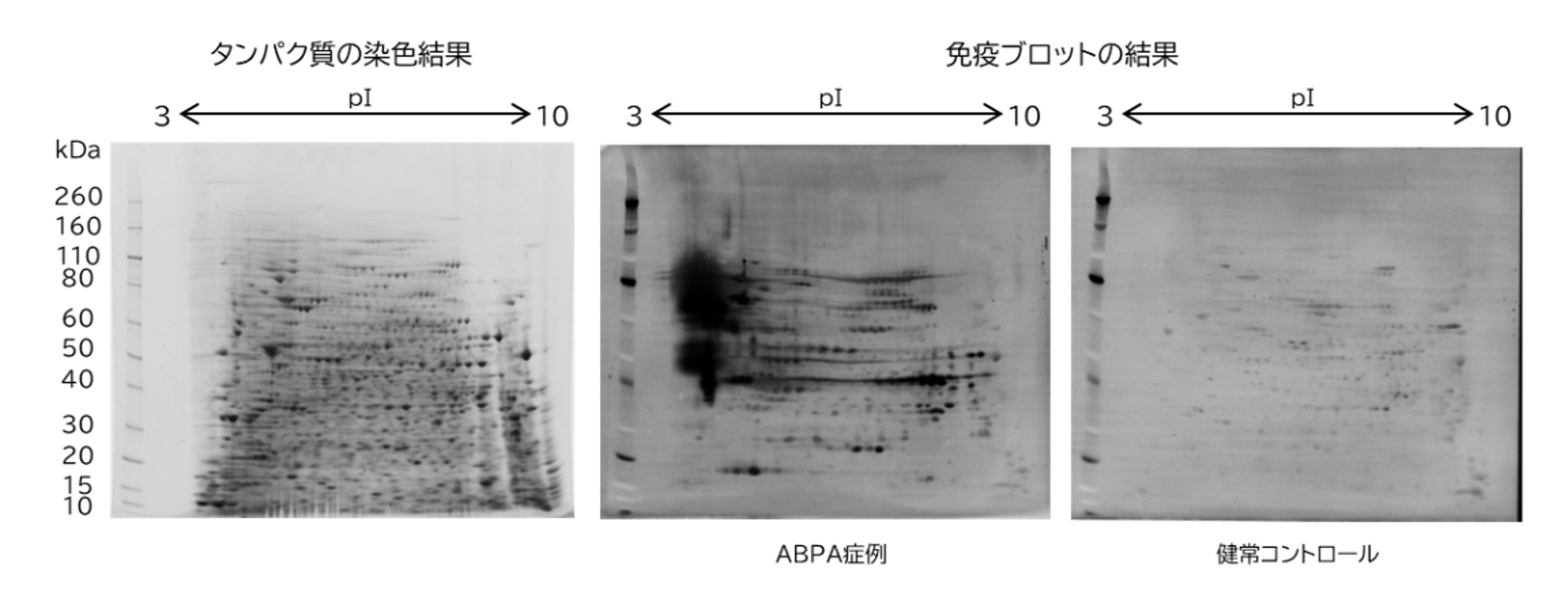 A. fumigatus のタンパク質を二次元電気泳動法で分離し、免疫ブロットによりアレルゲンを検出。