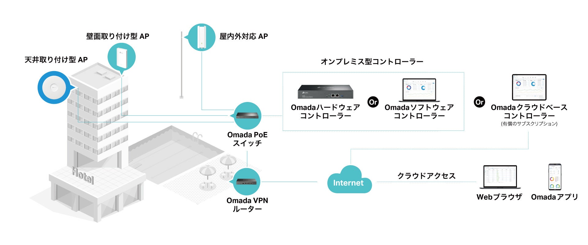 Omada SDN(Software Defined Networking)プラットフォームは、アクセスポイント・スイッチ・ルーター等のネットワークデバイスを統合し、100%集中型のクラウド管理を提供します。1つの管理画面から全てを操作できる拡張性の高いネットワークを作成。ホスピタリティ・教育・小売業界やオフィス等に、最適でシームレスな無線・有線接続をお届けします。