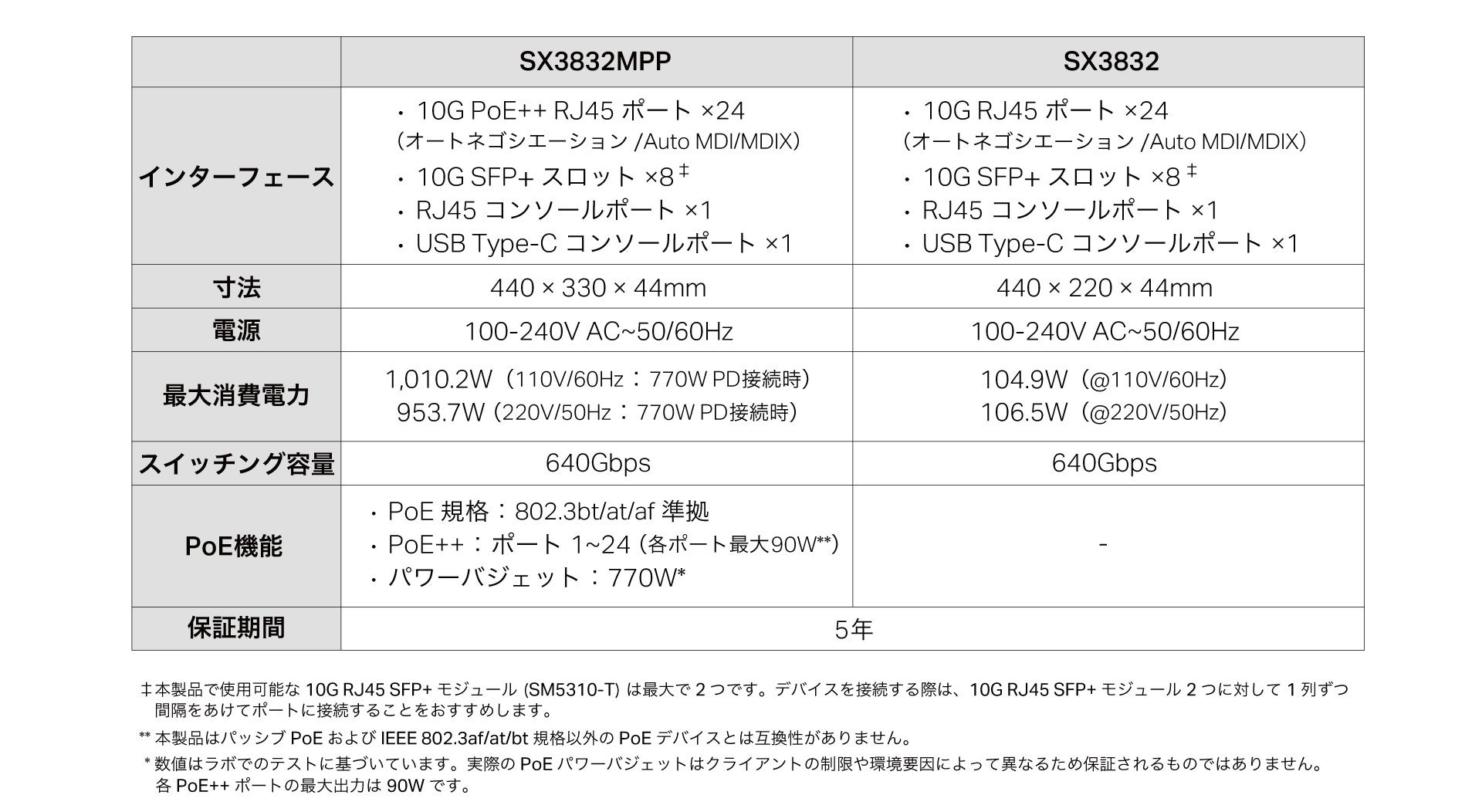 「SX3832MPP」と「SX3832」は、どちらもL2+スイッチング機能を搭載したフル10Gスイッチングハブとなっており、企業や組織のニーズに応じた柔軟なネットワーク構築を可能にします。また、両機種とも光ファイバーに対応しており大規模なネットワーク環境にも対応することができます。さらに、拡張性の高いPoE++機能を備えた「SX3832MPP」は、IoTや監視ソリューションに最適です。