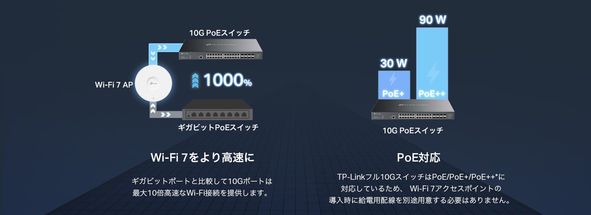 10Gbps・2.5Gbps PoE接続に対応したWi-Fi 7アクセスポイントのポテンシャルを活かすのに最適です。