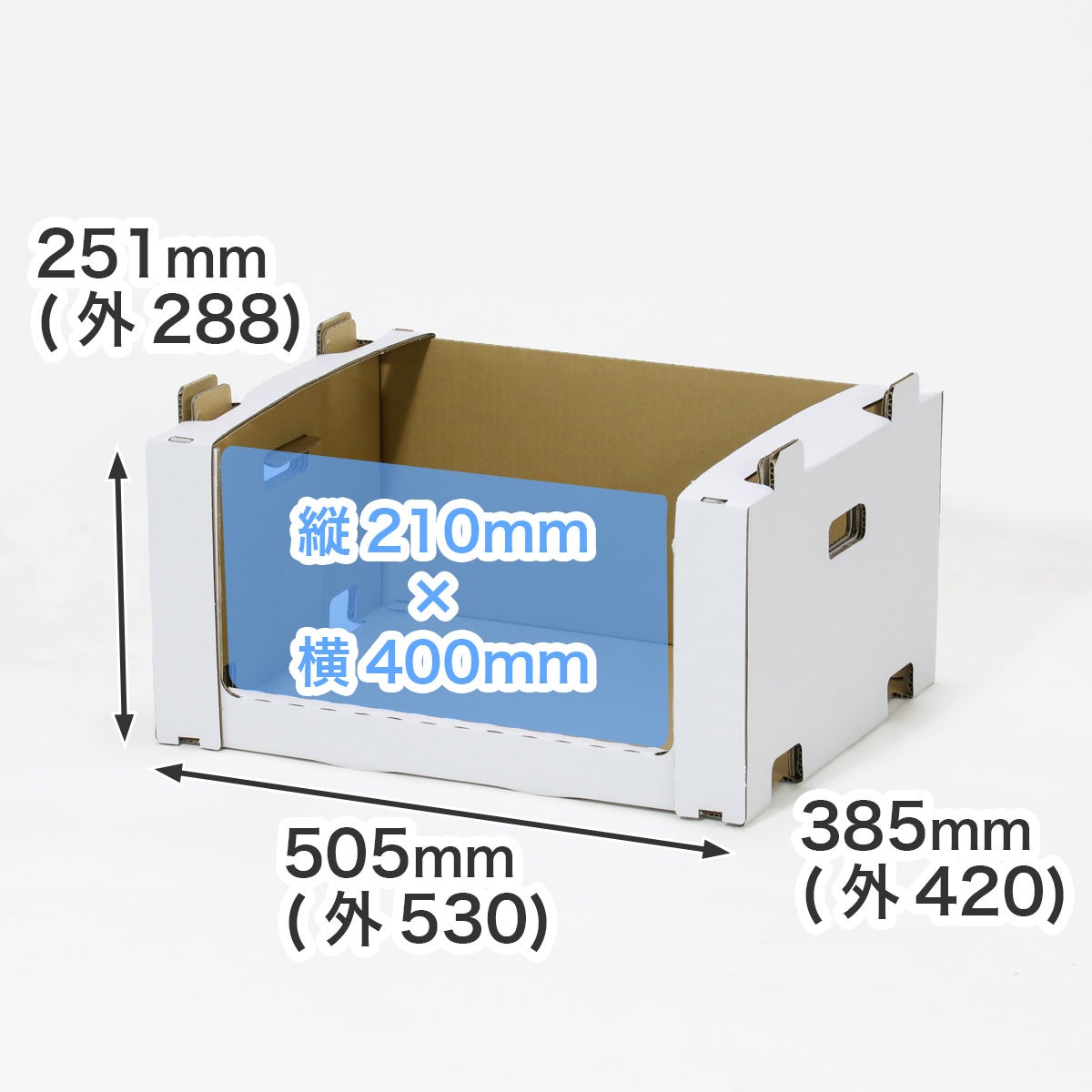 天面と底面に差し込み構造を設けており、積み重ねるだけで安定した棚としてご利用いただけます。物流倉庫やオフィスでのピッキング用の棚としても役立つダンボール製の収納ボックスです。