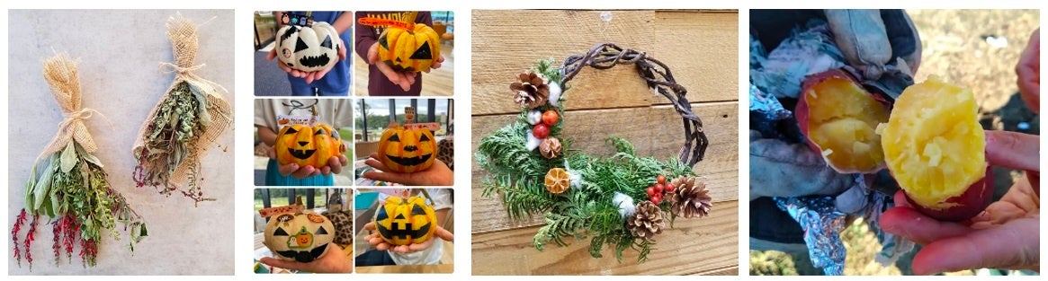 例:ハーブスワッグ作り、ハロウィンかぼちゃデコレーション、サツマイモのつるで編んだクリスマスリース作り、焼き芋大会など