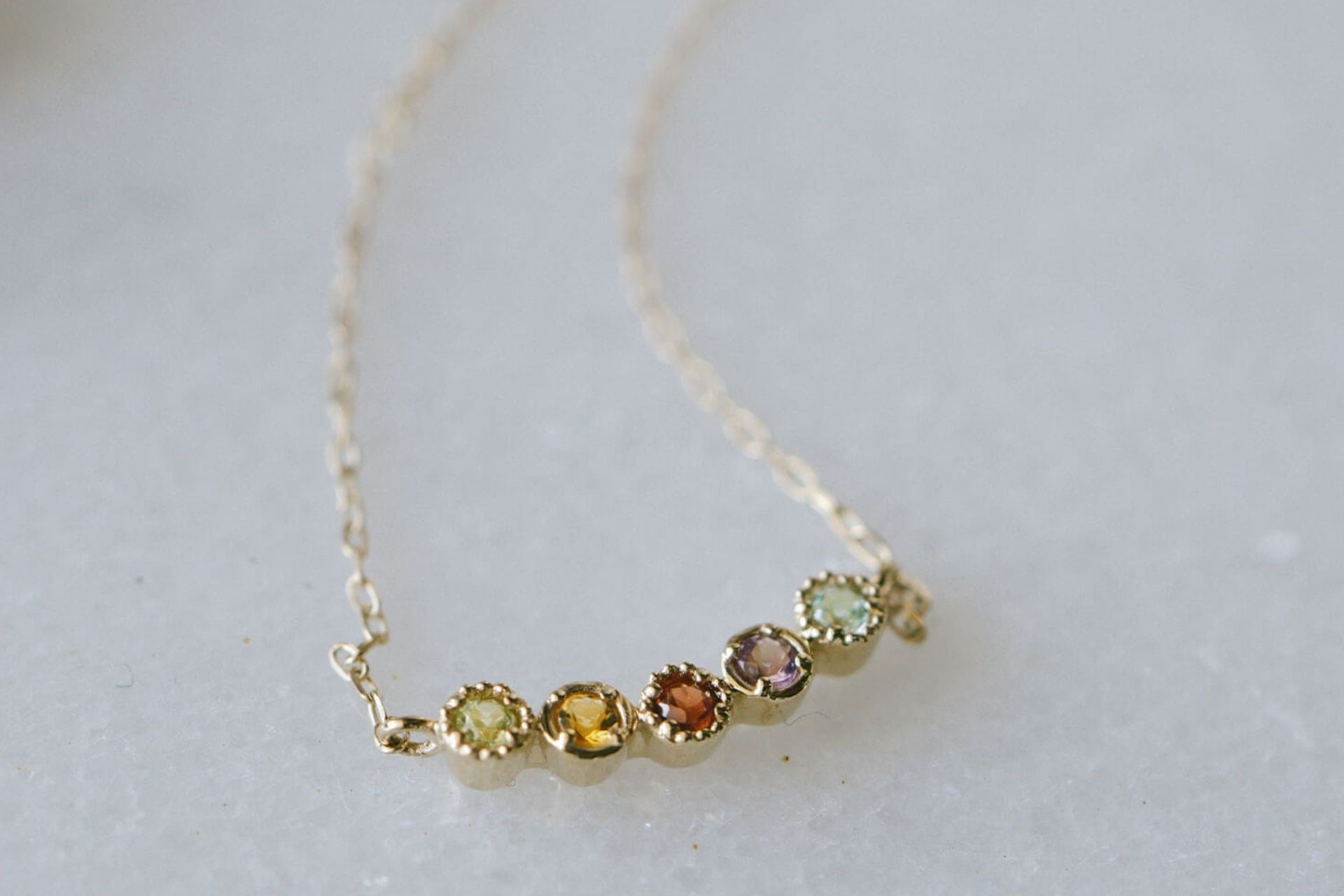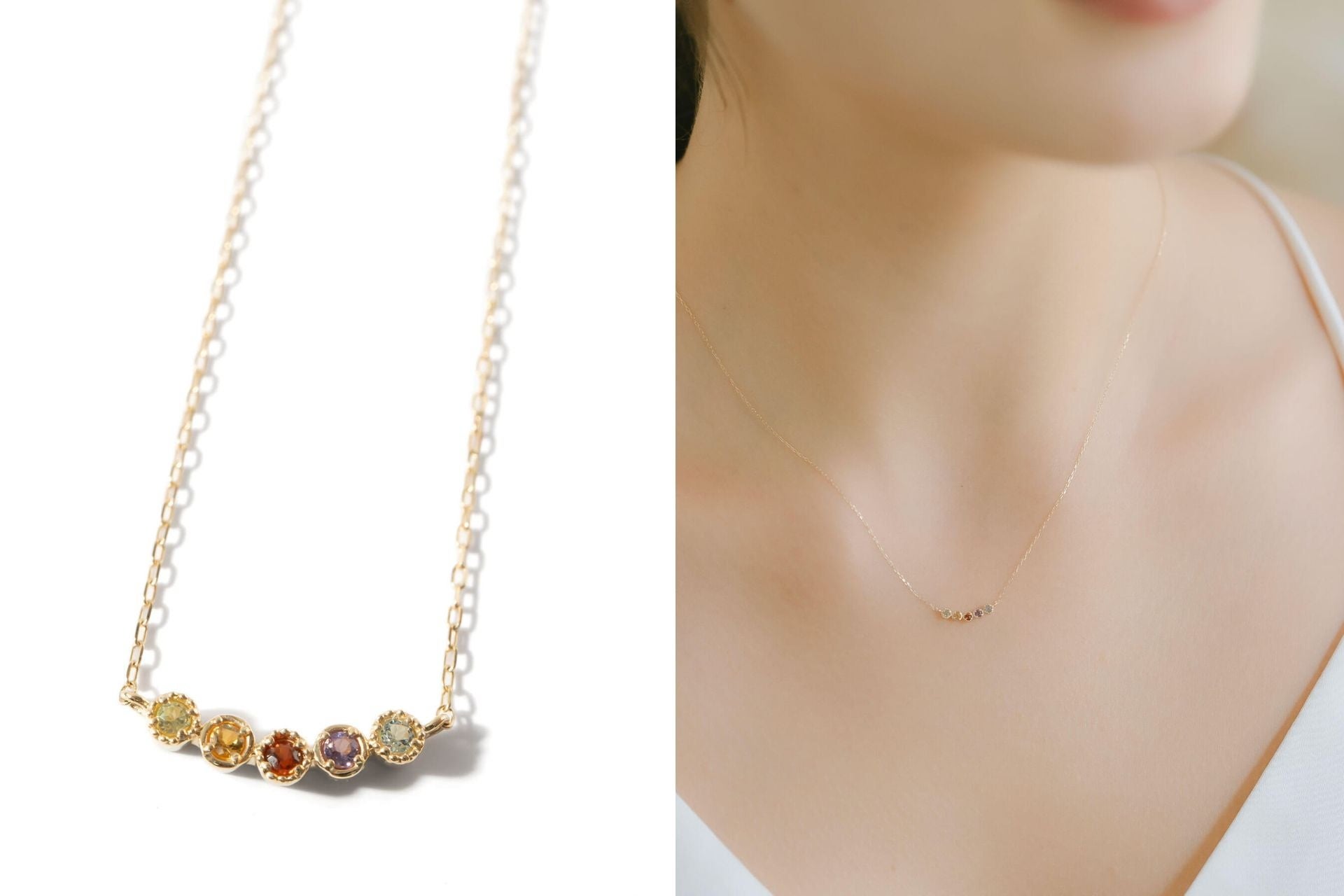 デコルテを彩る繊細な5つの天然石が印象的な、華奢で上品なゴールドネックレス。