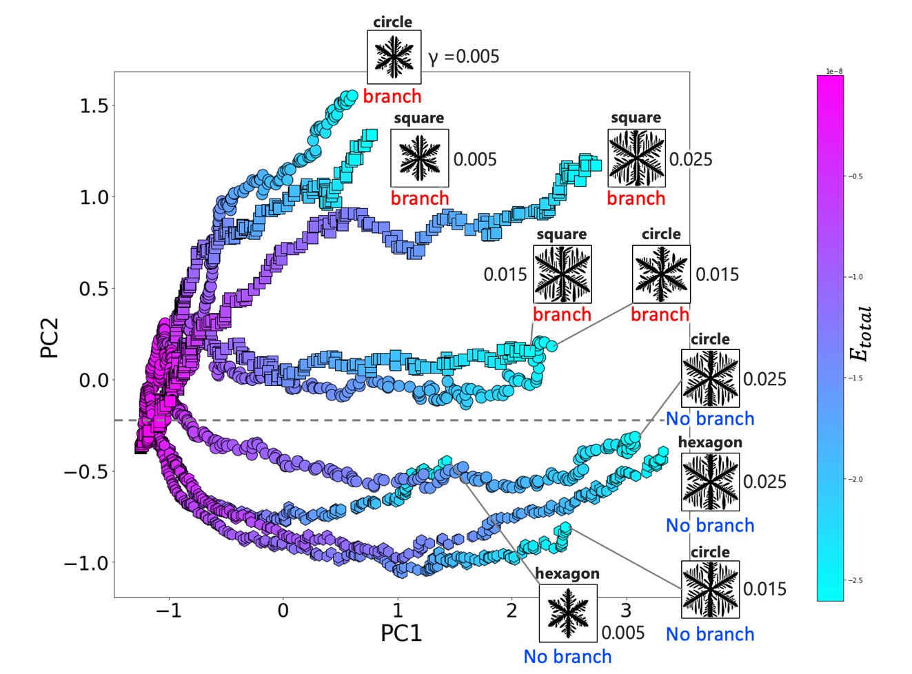 たとえば、樹枝状構造の成長に従ってPC1が増加し、エネルギーは減少していることがわかります。PC1が-1近くにロバストな分岐点があり、そこでエネルギーの急激な減少が起こることもわかりました。PC2についても調べたところ、PC2の正負が分岐の有無を決定付けていることも明らかになりました。