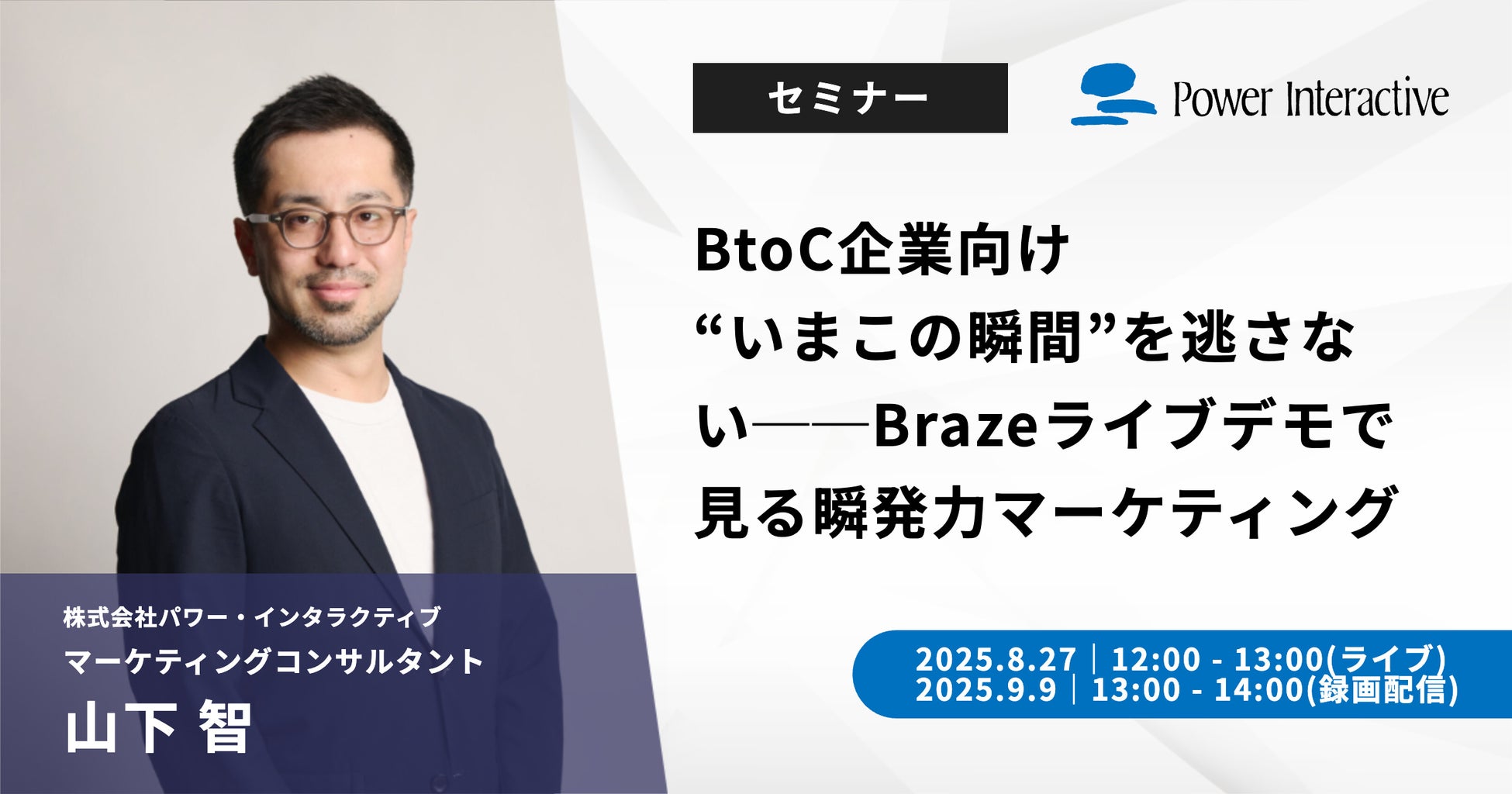 株式会社パワー・インタラクティブは、『BtoC企業向け “いまこの瞬間”を逃さない──Brazeライブデモで見る瞬発力マーケティング』を、8月27日にライブ開催、9月9日に録画配信を行います。