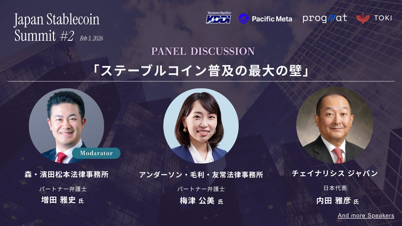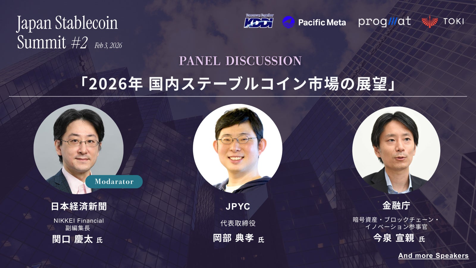 株式会社Pacific Meta(本社:東京都港区、代表取締役:岩崎 翔太)は、TOKI、KDDI、Progmatと共同で、ステーブルコインに特化したビジネスイベント「Japan Stablecoin Summit #2」を開催します。本リリースでは、本イベントに登壇予定のスピーカー情報を初めて公開いたします。