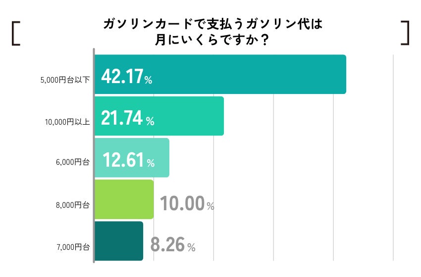 クレジットカードで支払うガソリン代はひと月当たり「5,000円以下」が最も多く、全体の42%を占める。次いで「10,000円以上」が多く、全体の約22%を占める。
