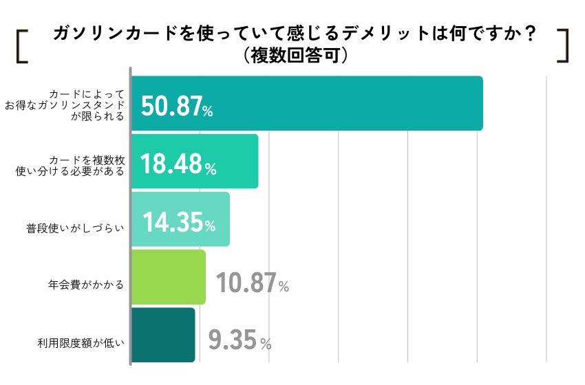 ガソリンカードを使っていて感じるデメリットとして最も多く挙げられたのは「カードによってお得なスタンドが限られる」点。