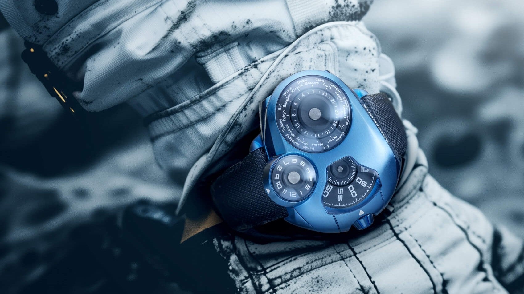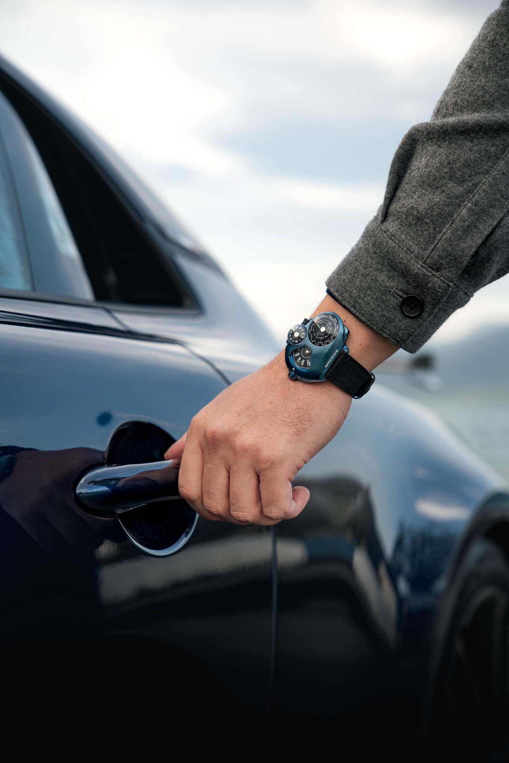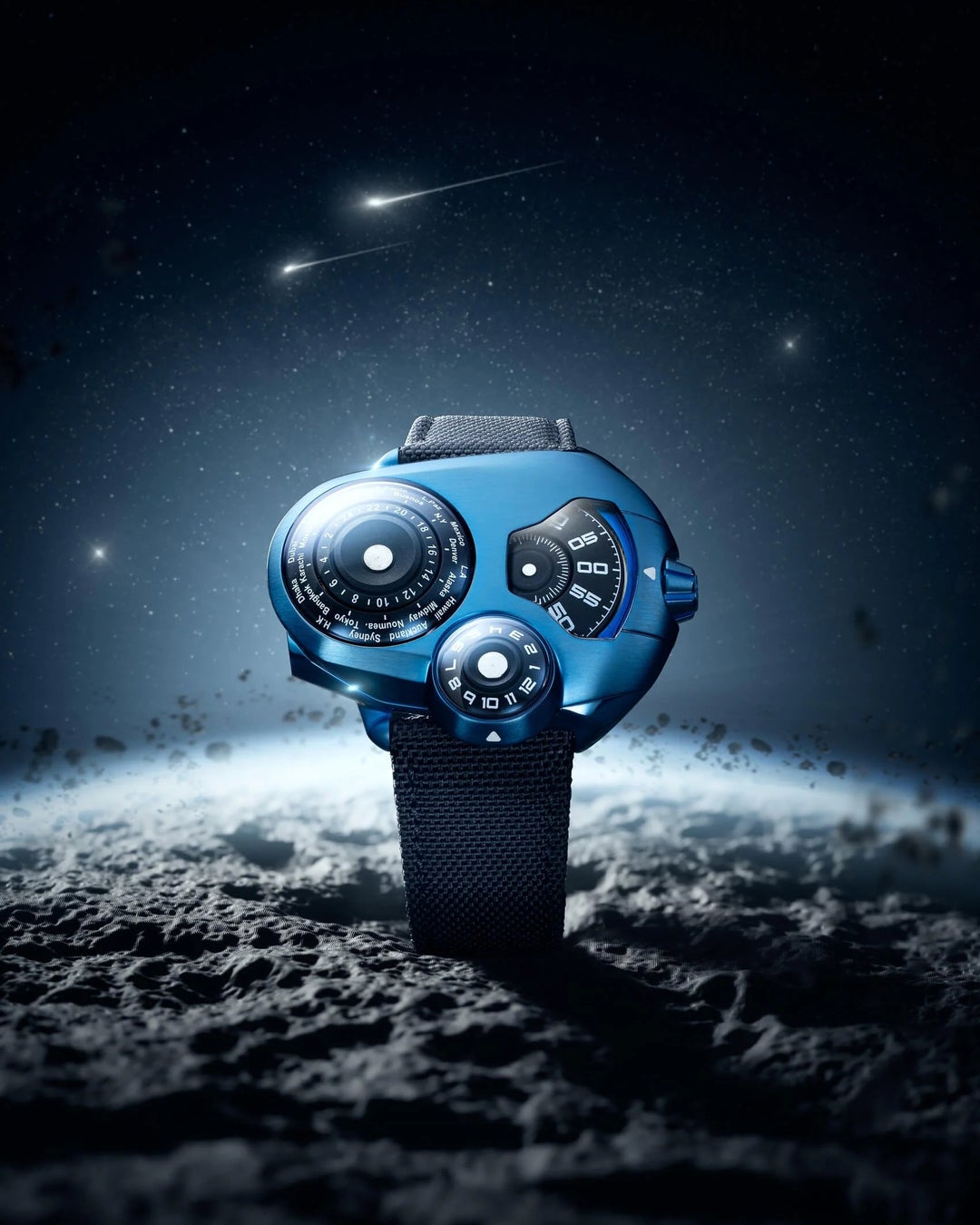 ケース素材には高強度で軽量なグレード5チタンを採用し、ポリッシュやブラッシュ、ビーズブラストを組み合わせることで立体的な表情を持たせています。カラーはブルー、シルバー、ブラックの3色展開で、各色世界限定200本の特別仕様となっている。内部にはスイス製のSoprod P024自動巻きムーブメントを搭載し、その上からパリで組み上げた独自モジュールを重ねることで、複数のディスク表示を正確に制御している。28,800振動の安定した動作と約38時間のパワーリザーブを備え、日常使いにも安心の性能。外装は、ラグからラグまで41.9mm、全長52.7mm、厚さ約15.9mmの力強いフォルムで、ドーム型サファイアクリスタルが存在感を引き立てる。風防には内外面に反射防止コーティングを施したサファイアクリスタルを採用し、裏蓋はスクリューバック仕様とすることで高い耐久性を確保している。三段階クラウンにより世界時間からローカルタイムまでスムーズに切り替えができ、複雑なディスク構造を意識させない快適な操作性を実現している。