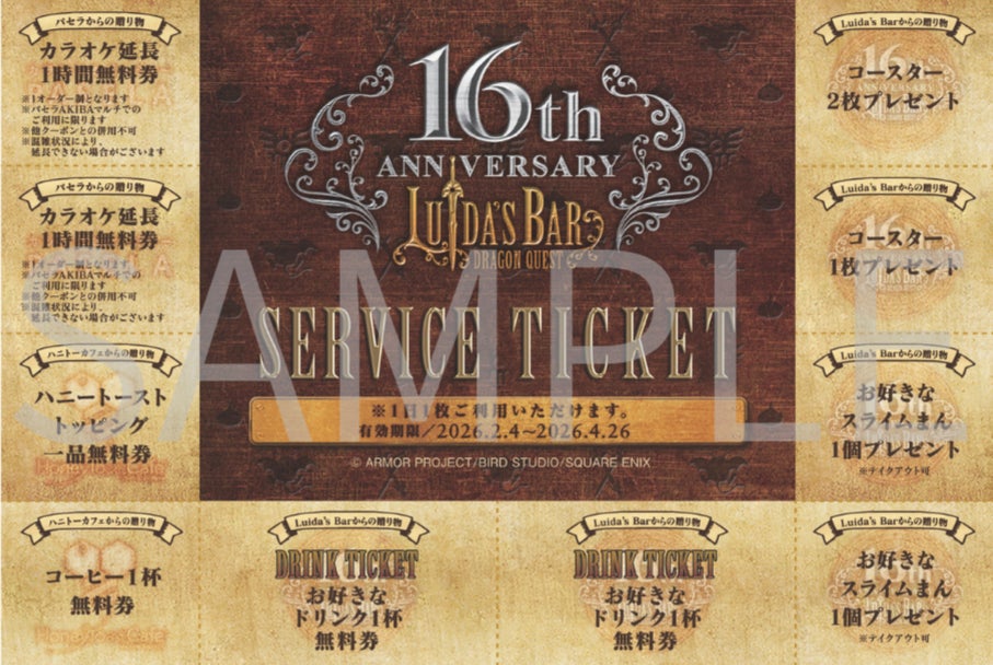 『ルイーダの酒場誕生16周年』を記念し、2026年1月28日(水)から対象となる期間にご来店いただいたお客様には、「16周年記念ステッカー」をはじめ、「16周年記念スペシャルくじ」や、“超”お得なクーポンチケットのプレゼントに加え、お祝いの記念ドリンクもご用意いたしました!
