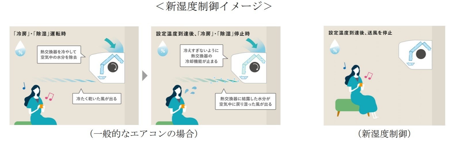 また、新たな湿度制御の搭載により、設定温度到達後の安定運転時に発生する湿度上昇を抑制し、温度と湿度のバランスを維持することで快適性の向上を実現しました。特に、安定運転時間が長い傾向にあるZEH(※5)を含む高気密・高断熱住宅において、より効果が期待できます。