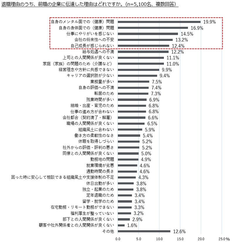 企業に伝えた退職理由は「自身のメンタル面・身体面での(健康)問題」が上位に