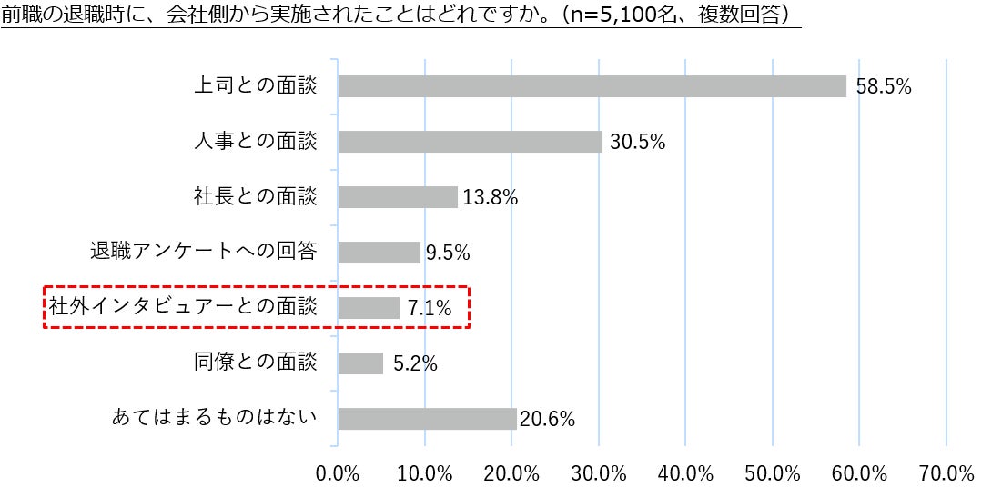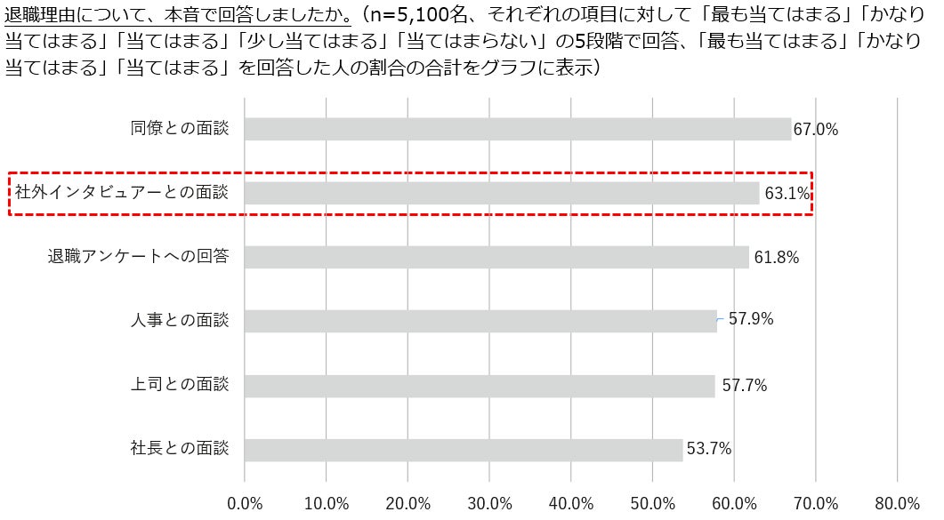 「上司との面談」が58.5%と最も多く、次いで「人事との面談」が30.5%と続きました。「社外インタビュアーとの面談」は7.1%と限定的な状況である一方、63.1%(「全て本音で話せた」18.2%と「やや本音で話せた」44.9%の合計)が退職理由を本音で話せたと回答しており、「人事との面談」(57.9%)や「上司との面談」(57.7%)を上回る結果となりました。同僚や利害関係のない第三者が聞き手となることで心理的ハードルが下がり、企業側として従業員の本音を引き出す有効な手段であることが裏付けられました。