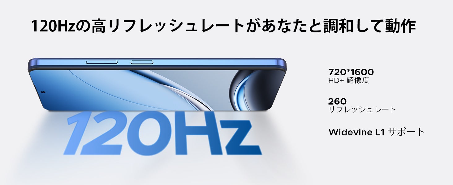 6.75インチのHD+ディスプレイは、120Hzのリフレッシュレートをサポートしており、滑らかなスクロールと鮮明な画面表示を実現します。ゲームや動画視聴、ウェブのブラウジングをスムーズに楽しむことができます。