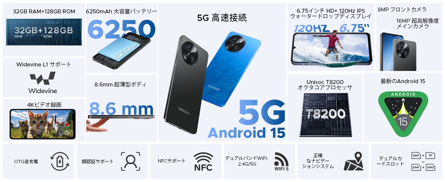 DOOGEE Note59は、Android 15システム、5G対応、AIカメラ、Widevine L1対応など、最先端の技術を搭載したスマートフォンであり、ユーザーのあらゆるニーズに応えます。