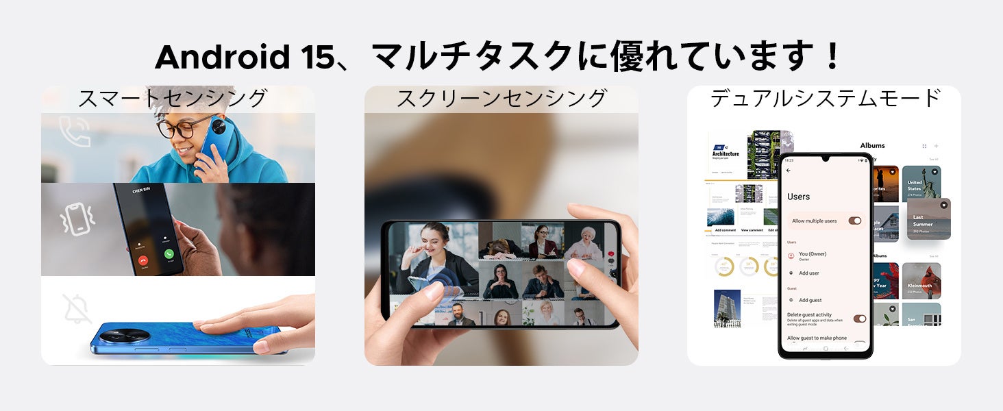DOOGEE Note59は、最新のAndroid 15システムを搭載しており、スマートフォン体験を革新します。ユーザーインターフェースは直感的で、セキュリティ面も強化され、最新のアプリや機能にスムーズに対応します。
