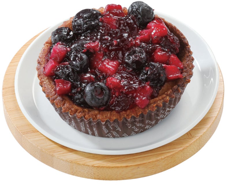 カスタード入りのタルト台に、ブルーベリージャムと4種のミックスベリー(ストロベリー、ブルーベリー、ラズベリー、クランベリー)をトッピングしました。おやつやティータイム、パーティーなどにおすすめ。食べきりサイズのタルトです。