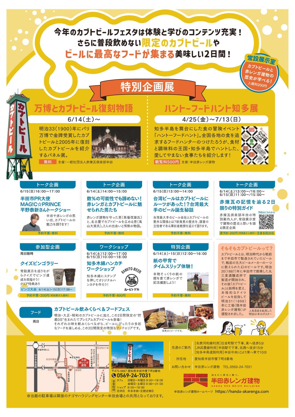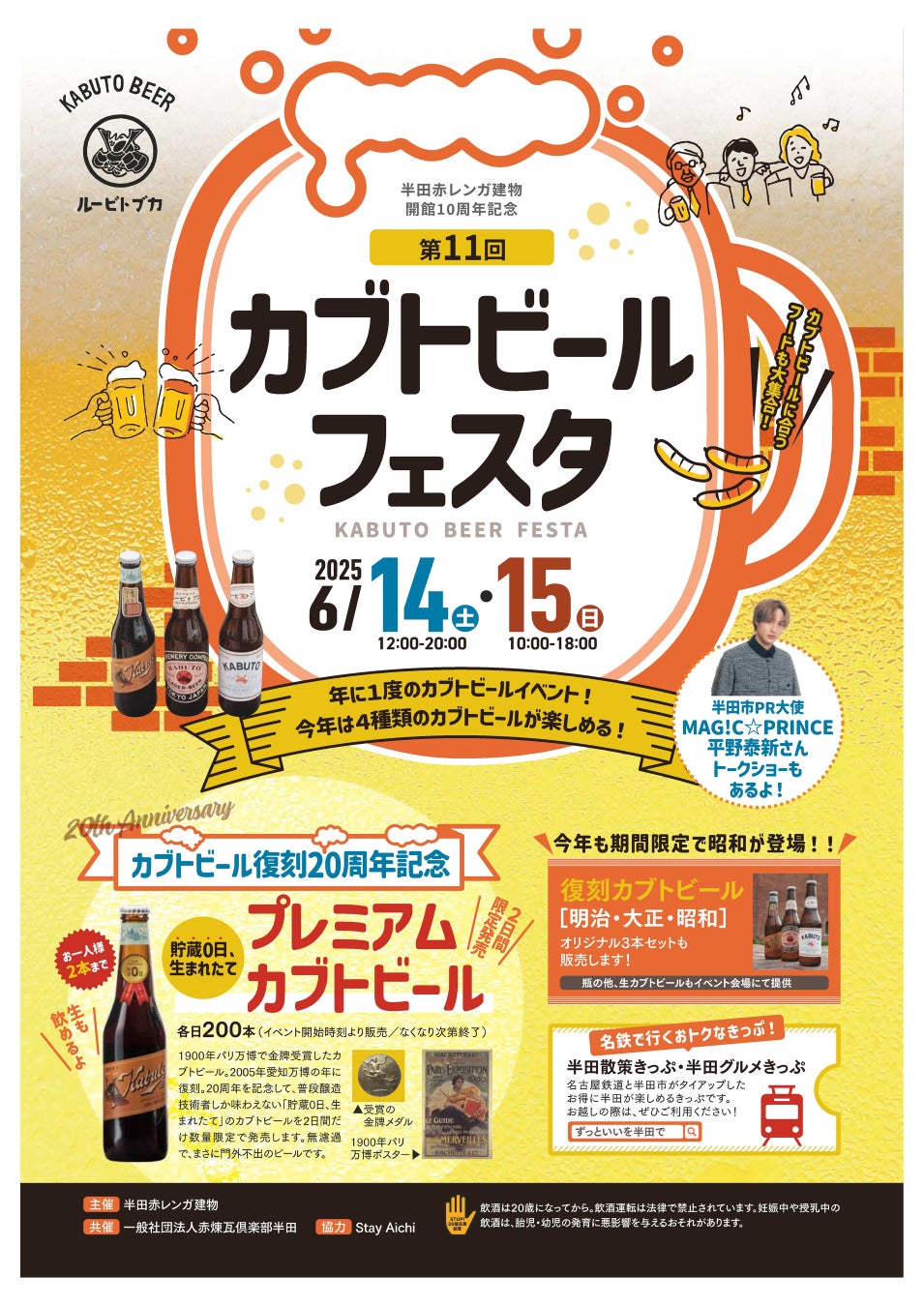 2025年、明治時代に半田赤レンガ建物で生まれた「カブトビール」が復刻して20周年を迎えます。これを記念し、半田赤レンガ建物で「カブトビールフェスタ2025」を開催します。復刻ビール4種(明治・大正・昭和・明治プレミアム)の飲みくらべや、特別企画展、トークイベントなどを通して、カブトビールの魅力をまるごと体感できる2日間です。