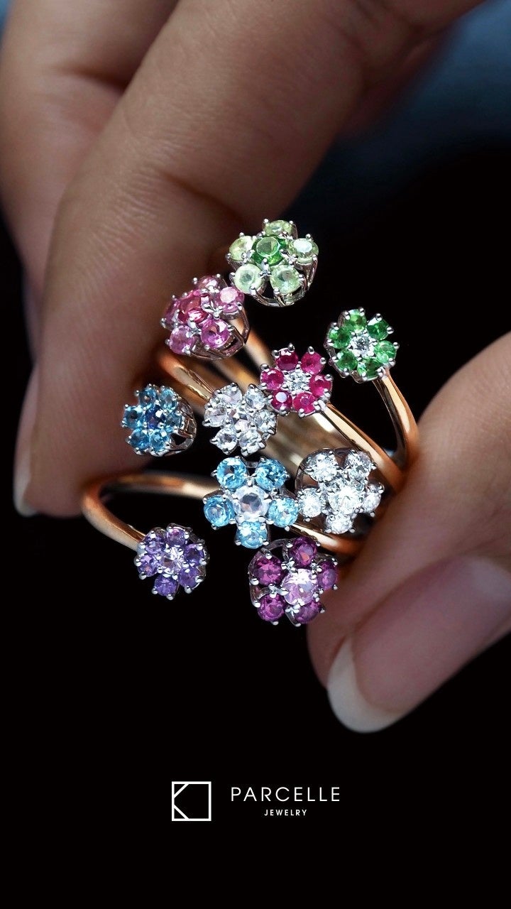 「ポンポネ」はパーセル ジュエリーのシグネチャーとして知られる、ブーケのようなリング。クラシックな中石の取り巻きと槌目入りのアームが印象的で、洗練された華やかさを備えています。「ポンポネモザイク」など、ストーンの組み合わせに個性が光るバリエーションも豊富です。