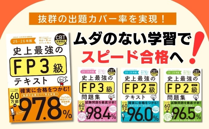過去15年間のFP技能検定(学科、実技3科目)の全問題をデータ化し、テーマ・論点ごとに問題と解答を分類・分析して、出題されるほとんどの問題に正解できる情報を厳選した教材です。史上最強FPシリーズは、本試験の95%以上をカバー!FP検定の合格ラインは60%なので、確実な合格を目指すことができます。