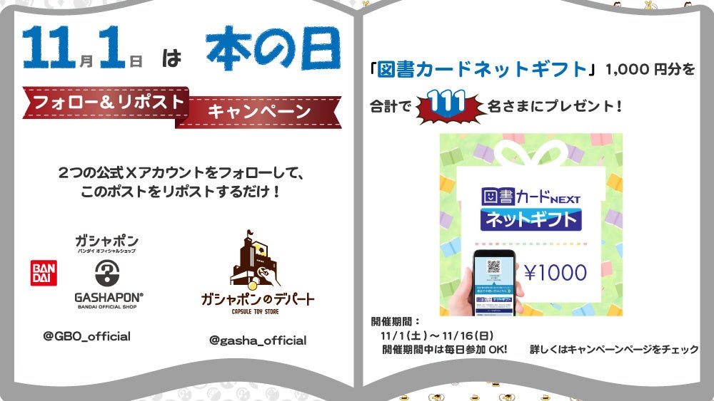 株式会社バンダイナムコエクスペリエンスと株式会社バンダイナムコアミューズメントが企画・運営するカプセルトイ専門店『ガシャポンバンダイオフィシャルショップ』『ガシャポンのデパート』『本屋さんのガシャポンのデパート』は、X(旧ツイッター)の対象アカウントをフォローして応募すると、その場で「図書カードネットギフト」1,000円分が111名さまに当たるキャンペーンを、11月1日(土)“本の日”に合わせ、2025年11月1日(土)から2025年11月16日(日)の期間開催します。